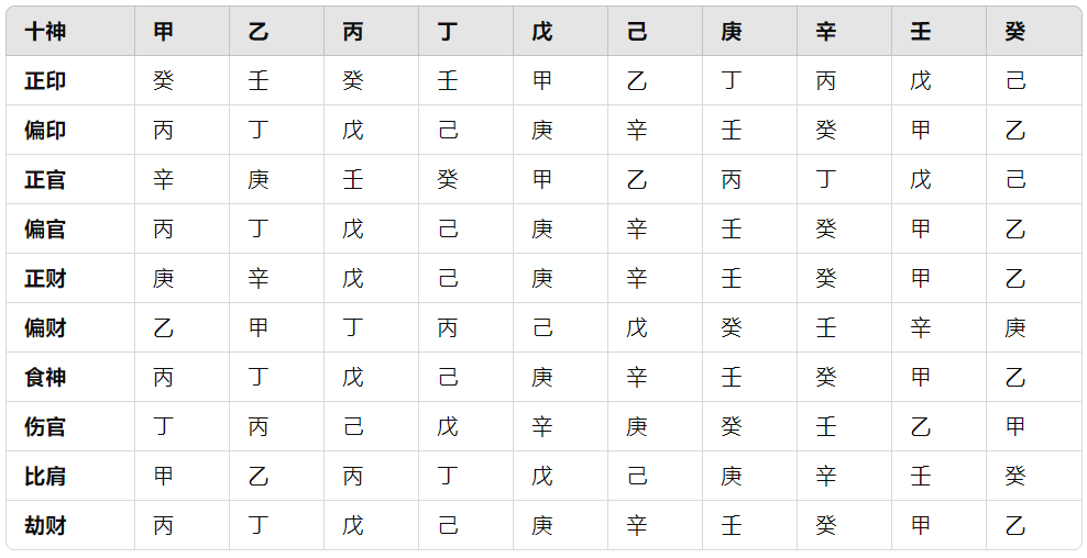 天干十神关系的对比表